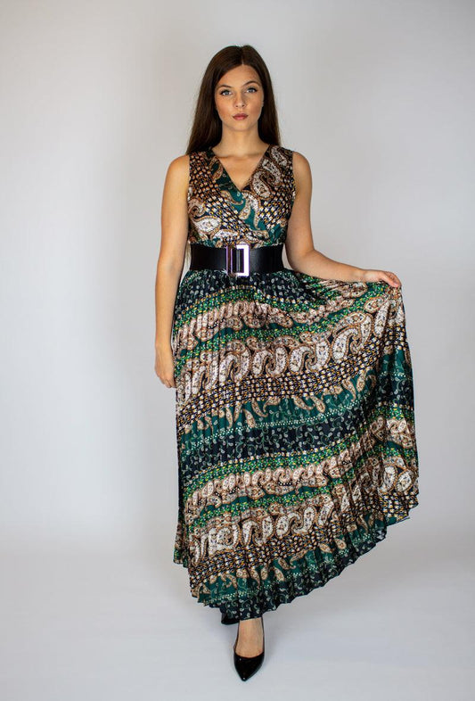 Sötétzöld pliszírozott maxiruha